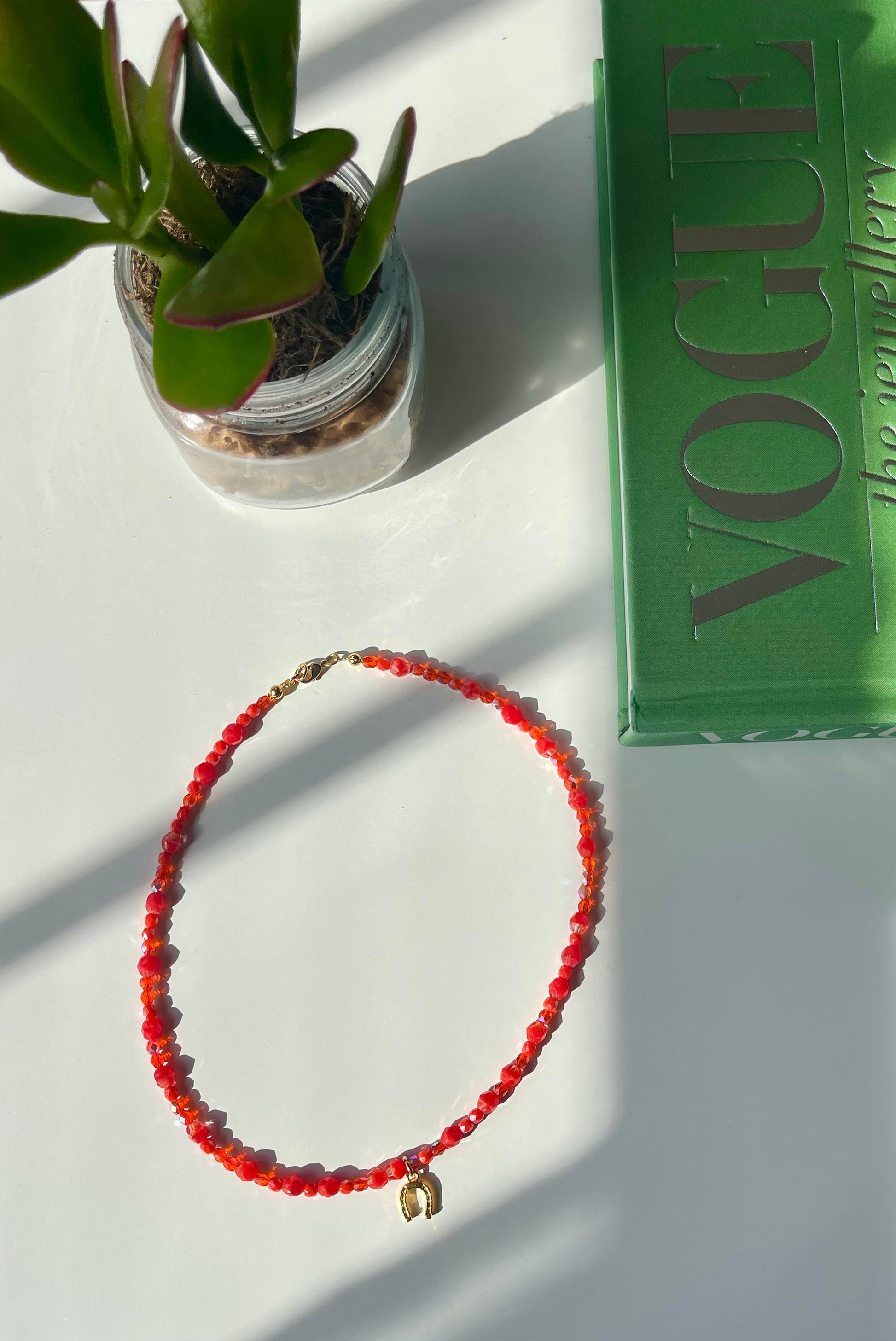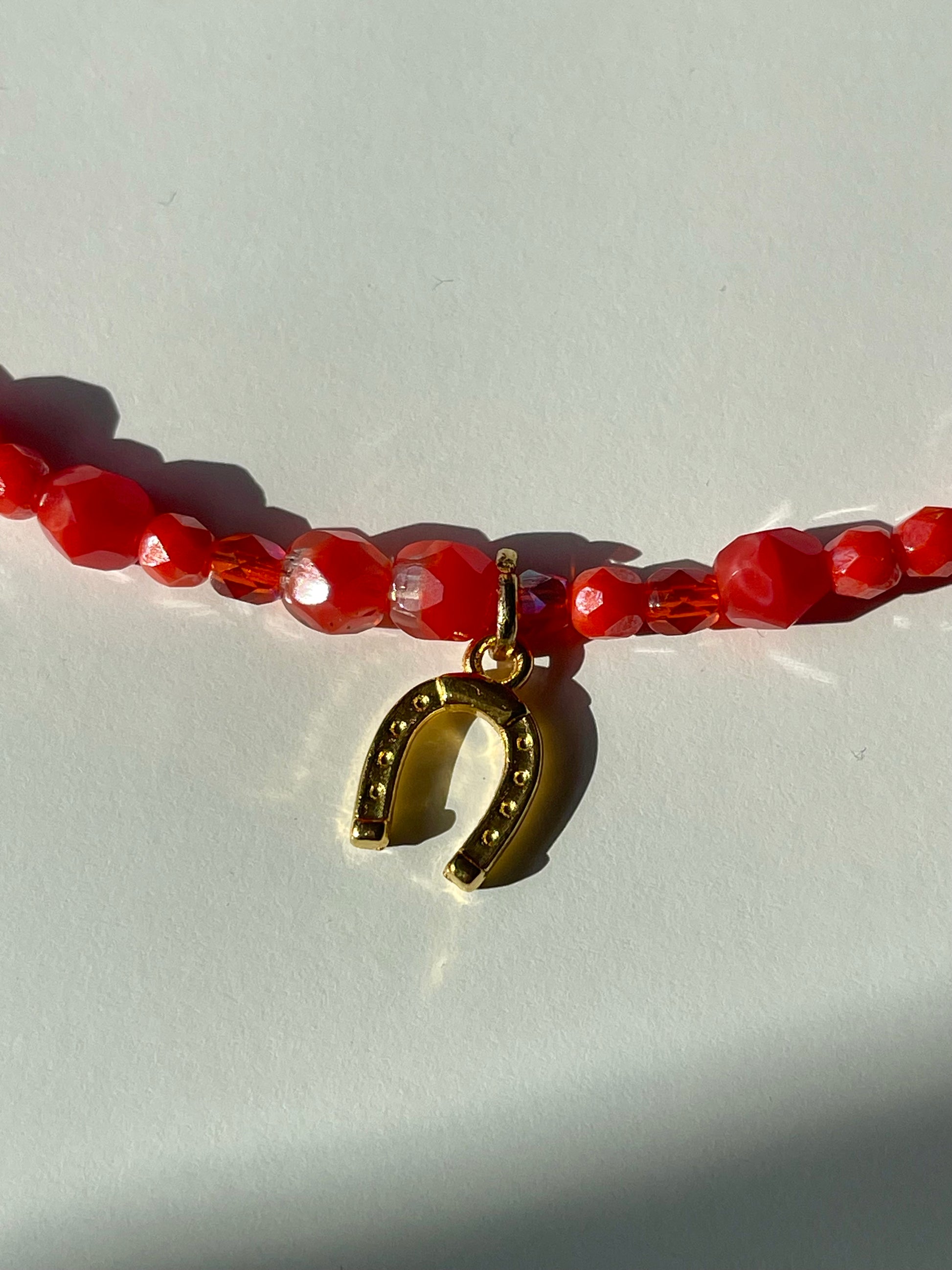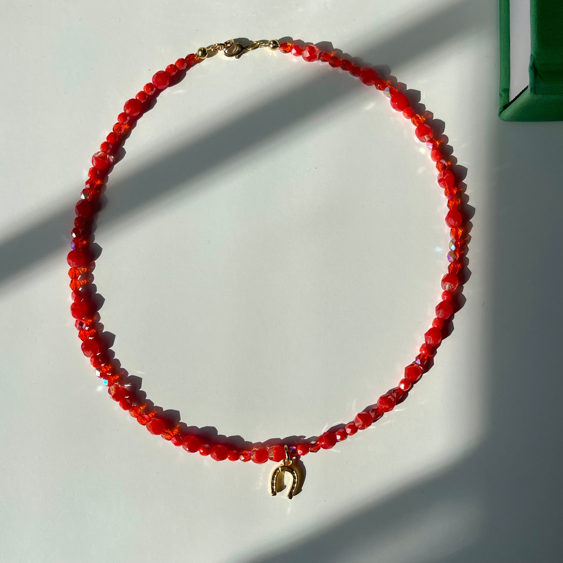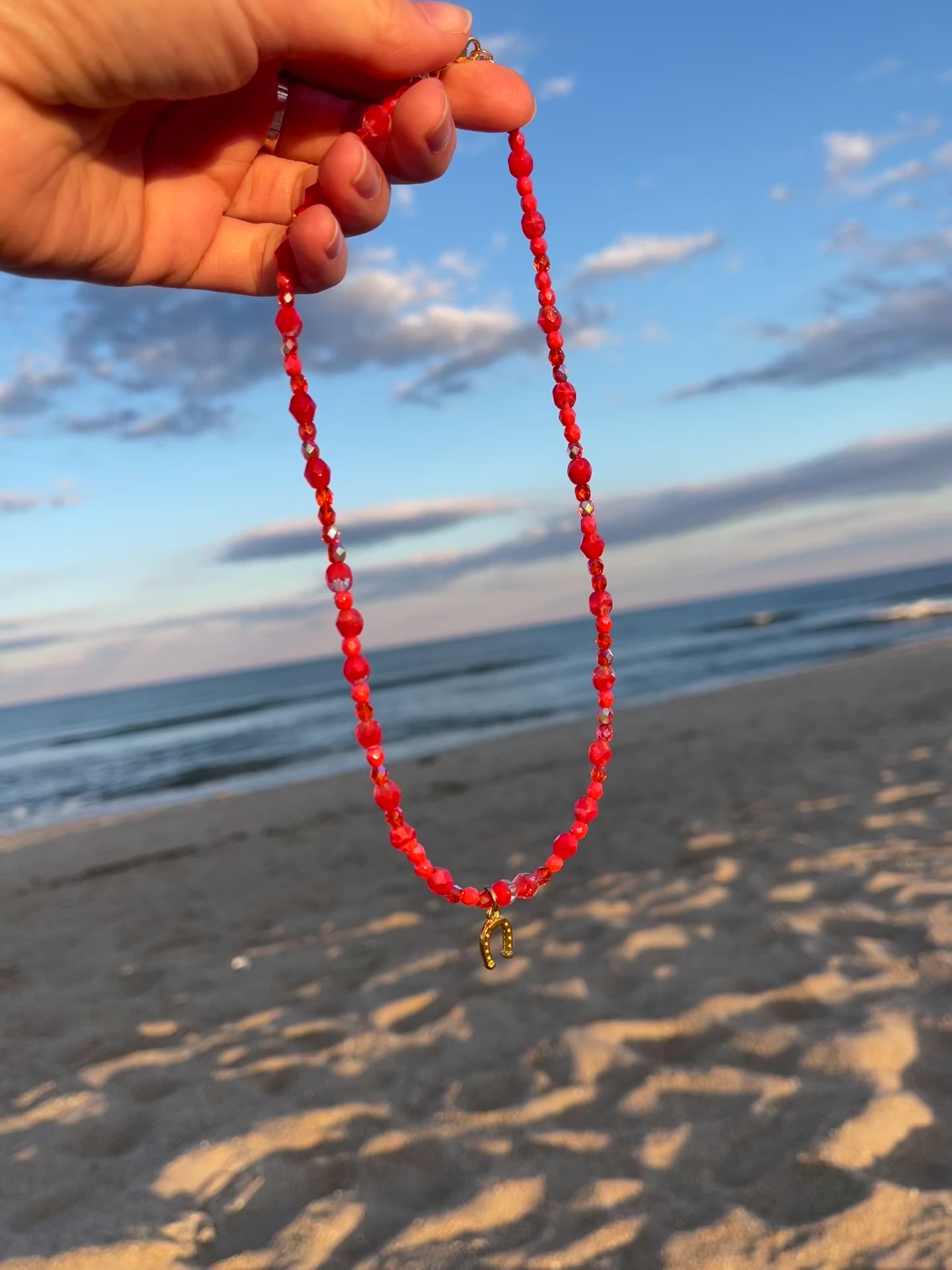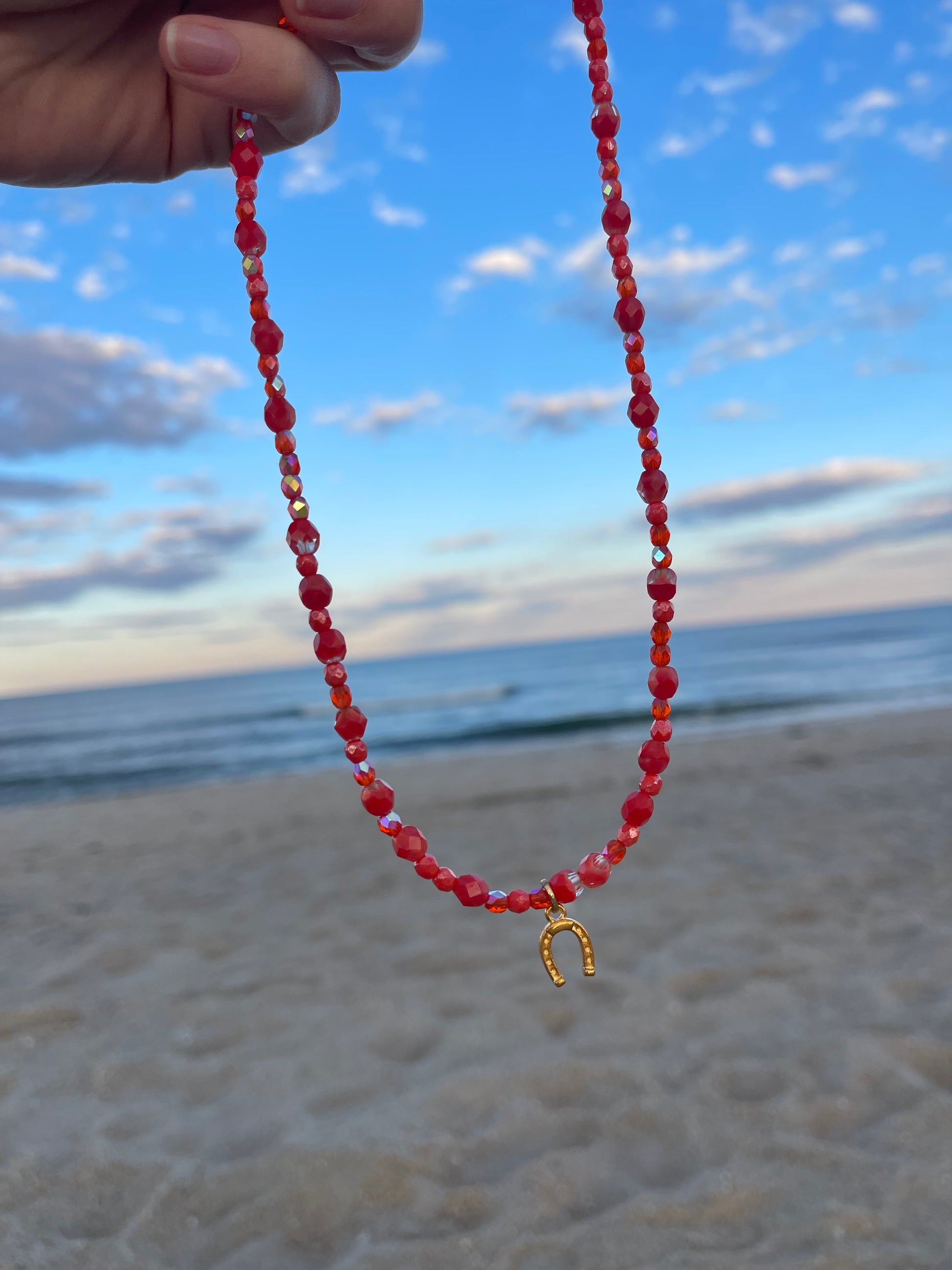 "Agregue un toque de suerte (con un toque de encanto de vaquera) a su atuendo con el collar The Lucky Riders. Este collar con dije de herradura de inspiración costera presenta vibrantes cuentas de vidrio tropicales, perfecto para cualquier ocasión, ya sea en la playa, el rodeo o Sólo un día informal."