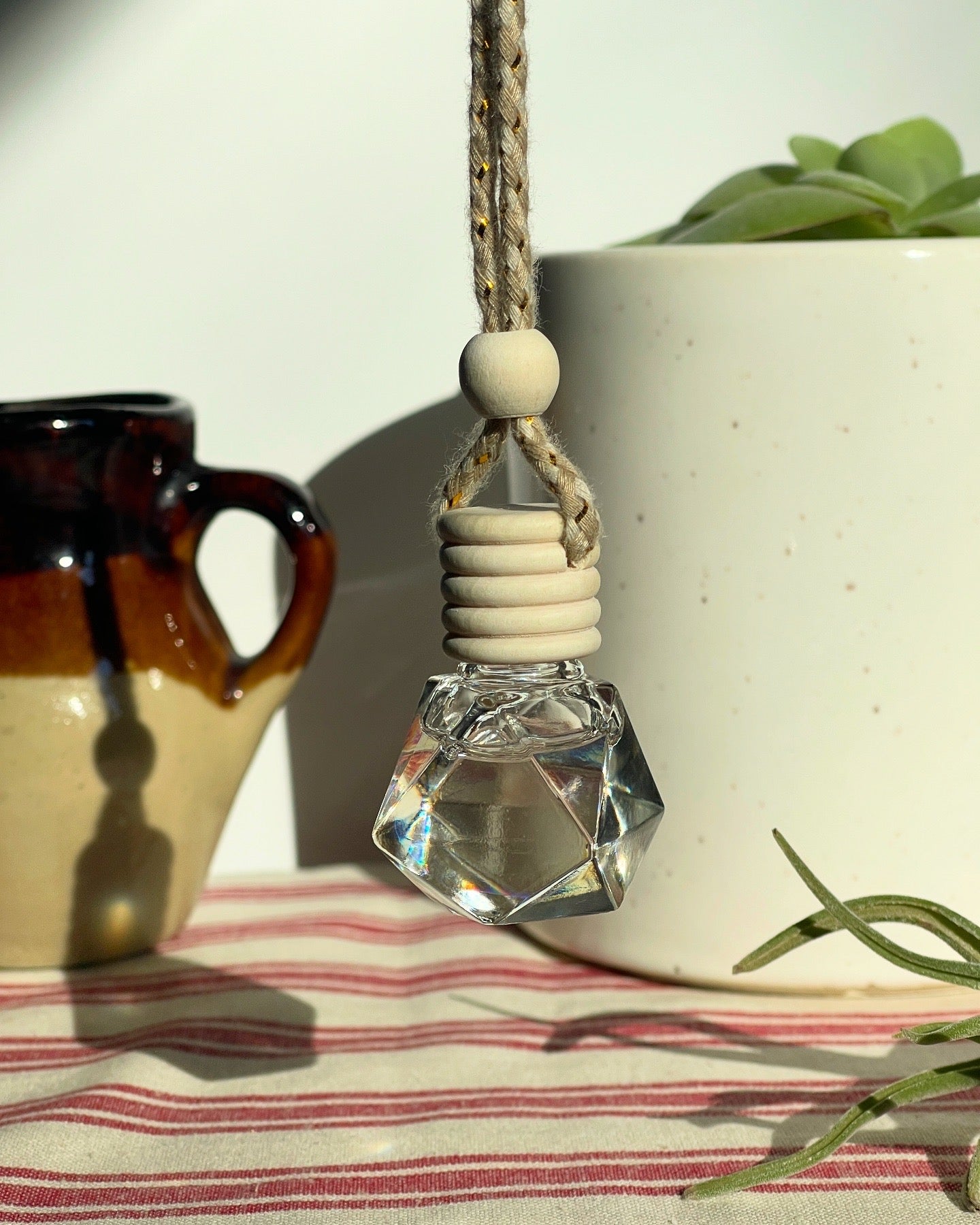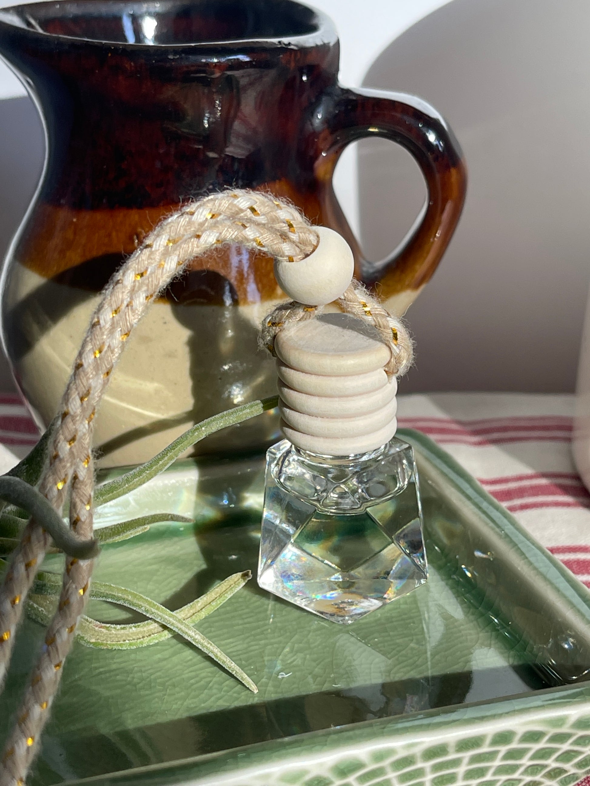 A thoughtfully crafted Coconut Scented Car Freshener, in a hand-filled glass and bamboo bottle with a cotton cord, contains premium coconut scent oil. This sustainable product can be easily reused and refilled.