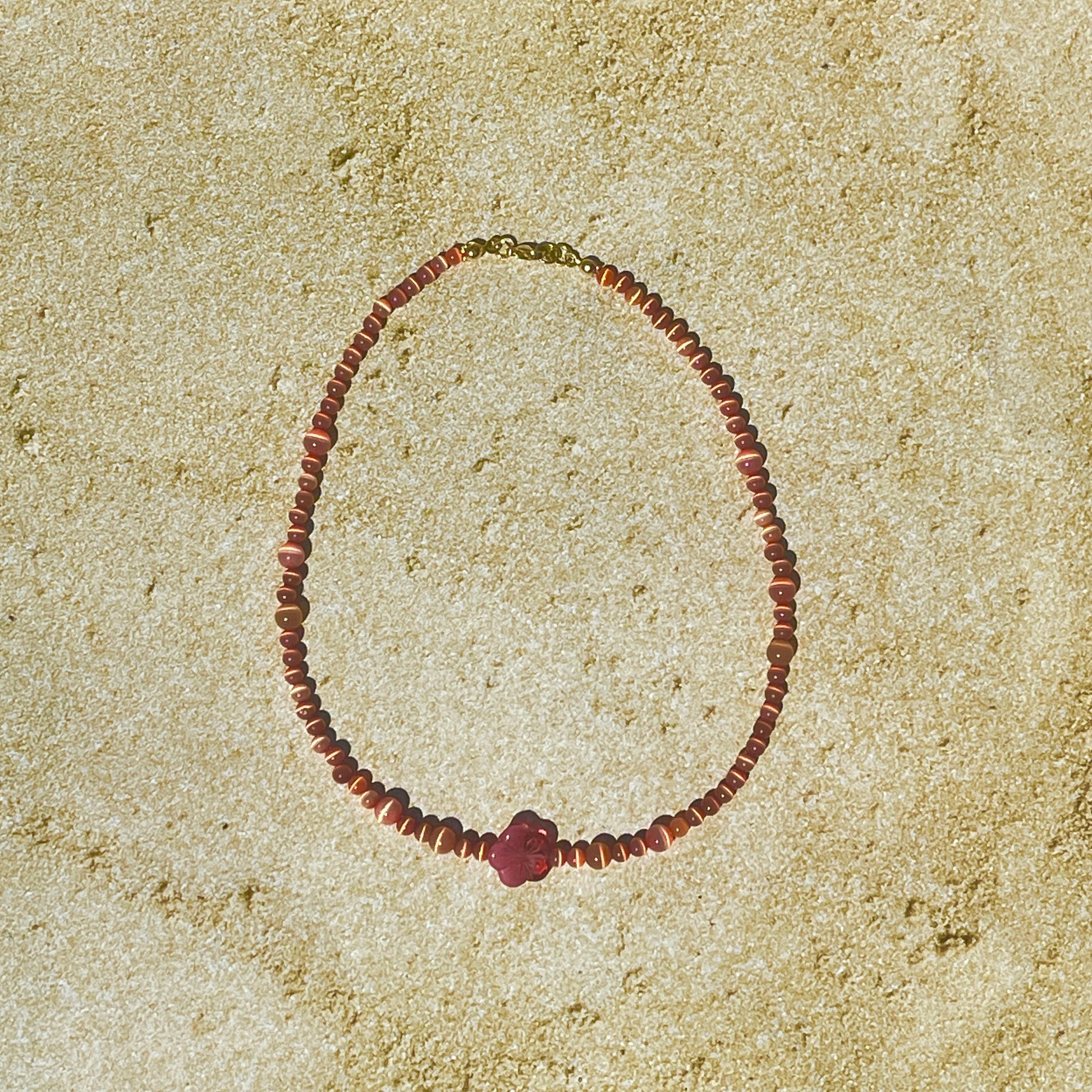 Add some tropical charm to your outfit with our Hibiscus Necklace! This playful piece features a delicate glass hibiscus flower in vibrant orange and raspberry hues. Just remember to handle the fragile glass beads with care.